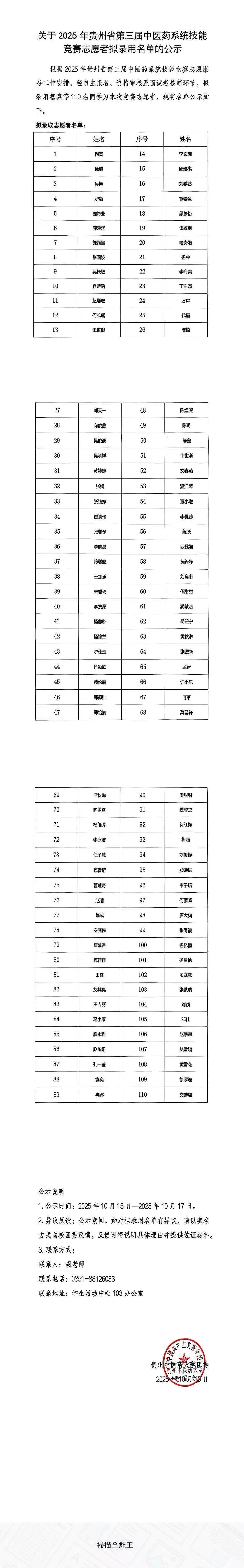 根据2025年贵州省第三届中医药系统技能竞赛志愿服务工作安排,经自主报名、资格审核及面试考核等环节,拟录用杨真等110名同学为本次竞赛志愿者,现将名单公示如下。