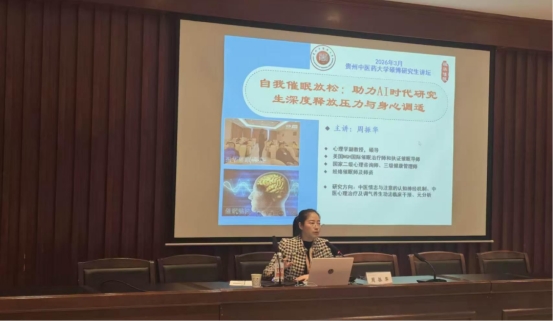 讲座中,周振华从AI时代研究生普遍面临的高压现状切入,系统剖析了科研任务、学术竞争及技术变革所带来的心理挑战,引导同学们正确认识压力源。随后,她聚焦“催眠的科学解读”,通过专业讲解与临床实例,破除对催眠的常见误解,阐明其作为高度专注放松状态的科学本质,为后续实践环节奠定了理论基础。