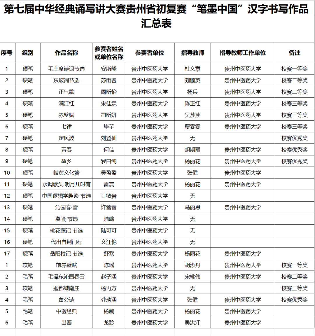 为深入贯彻党的二十大和二十届三中全会精神,传承发展中华优秀语言文化,落实全国青少年读书行动,5月至6月初,由贵州中医药大学举办的“笔墨中国”汉字书写大赛在我校花溪校区顺利举办。