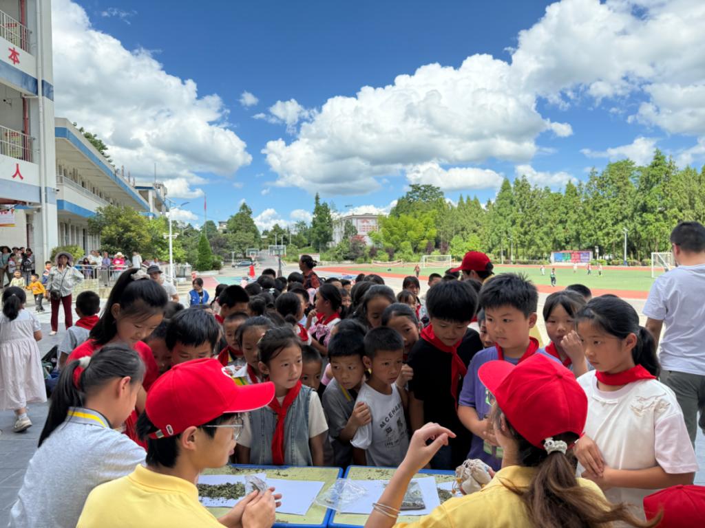 7月4日,实践团抵达龙里县湾寨小学。针对青少年脊柱健康问题,团队开展全覆盖式脊柱侧弯筛查,为237名学生建立健康档案,并通过动态演示、互动问答等形式讲解“三正三避”防护口诀。实践团在此开设中医药文化课堂,以“薄荷醒神”“丁香降逆”等生活案例解析中药原理,指导小学生制作驱蚊香包,将理论知识转化为可触摸的实践体验。同时,实践团为同学们开展遵义会议精神专题宣讲,通过历史照片、革命文物复刻品等载体,带领学生重温长征故事,在青少年心中播撒红色种子。